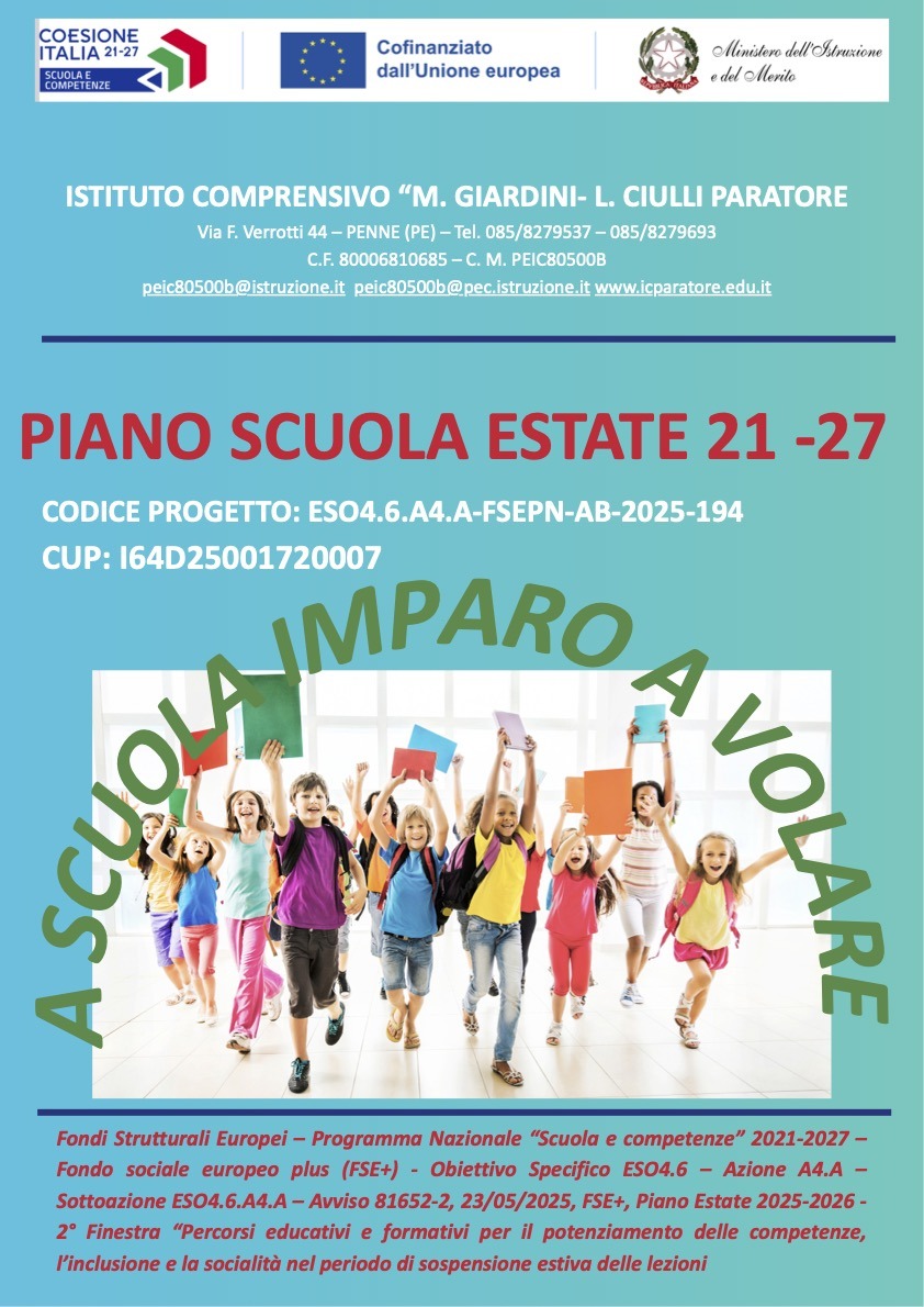 Fondi Strutturali Europei – Programma Nazionale “Scuola e competenze” 2021-2027 – Fondo sociale europeo plus (FSE+) - Obiettivo Specifico ESO4.6 – Azione A4.A – Sottoazione ESO4.6.A4.A – Avviso 81652-2, 23/05/2025, FSE+, Piano Estate 2025-2026 - 2° Finestra “Percorsi educativi e formativi per il potenziamento delle competenze, l’inclusione e la socialità nel periodo di sospensione estiva delle lezioni